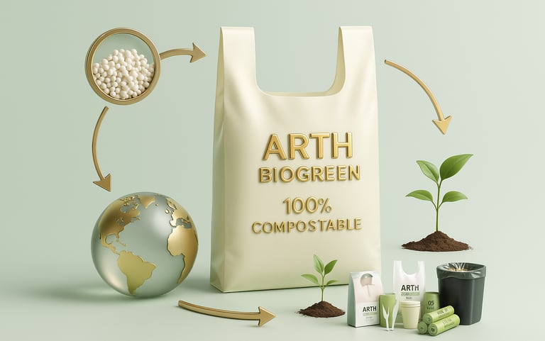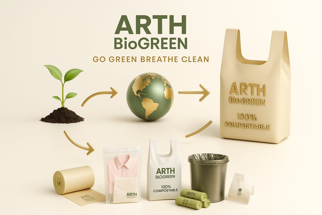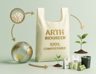 At ARth BioGreen, we stand at the forefront of a new environmental renaissance—where innovation meets responsibility and sustainability shines with the brilliance of gold. Guided by our philosophy “Go Green, Breathe Clean,” we transform the purity of nature into luxury-grade, 100% compostable solutions that honor both the earth and the people who cherish it.